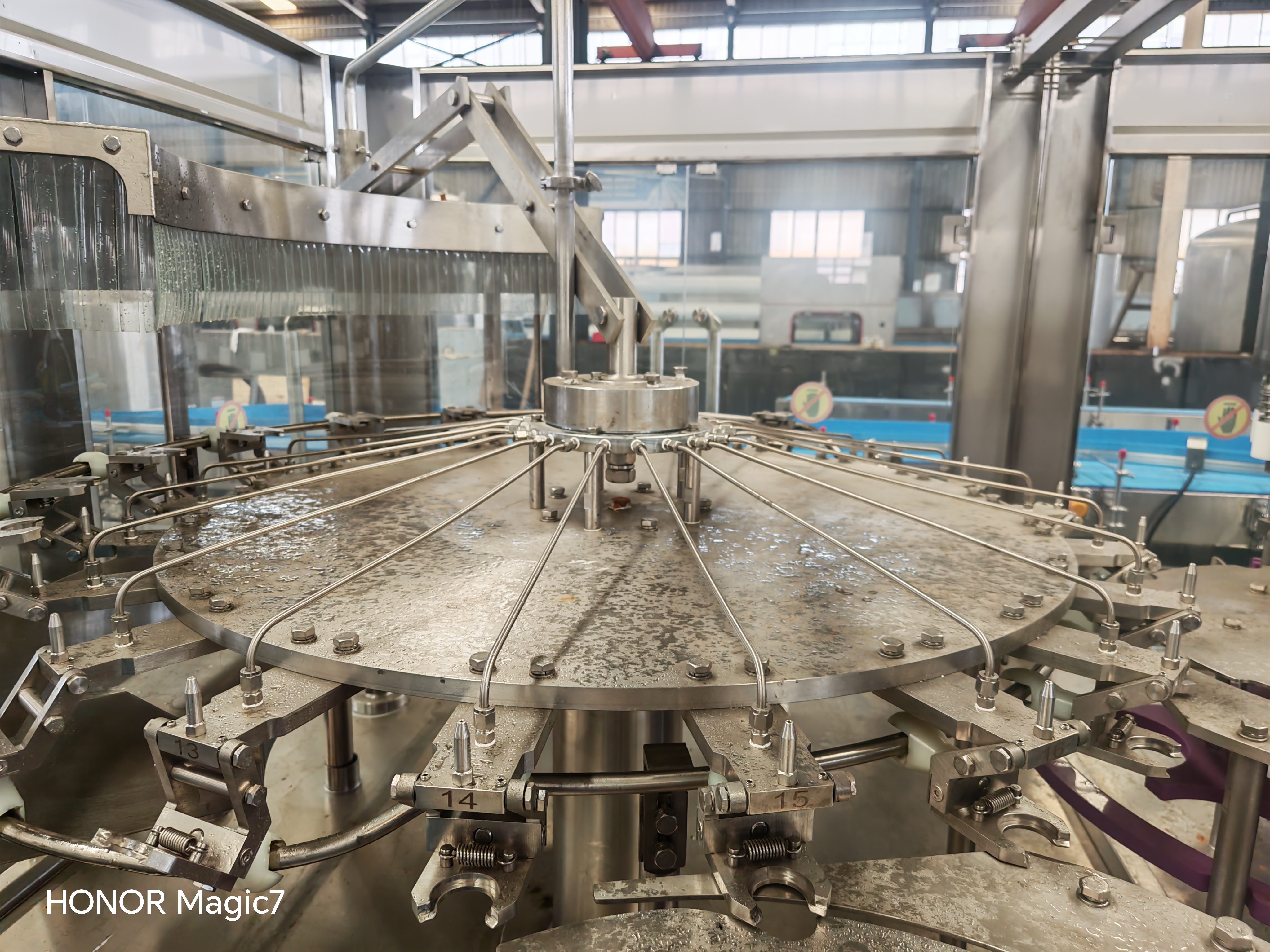 沖洗. 旋轉(zhuǎn)盤全部用不銹鋼加工而成。 大型平面帶齒軸承,運(yùn)轉(zhuǎn)平穩(wěn)、可靠。 采用本公司獨(dú)創(chuàng)的翻轉(zhuǎn)式不銹鋼卡瓶口瓶夾,瓶夾卡住瓶頸部位,避免了傳統(tǒng)瓶夾上的橡膠夾塊對瓶口螺紋部位造成的污染。 采用噴霧噴嘴,沖瓶水呈設(shè)定角度噴出,可沖洗到瓶子內(nèi)壁任何部位,沖洗徹底并節(jié)約沖瓶用水。 |